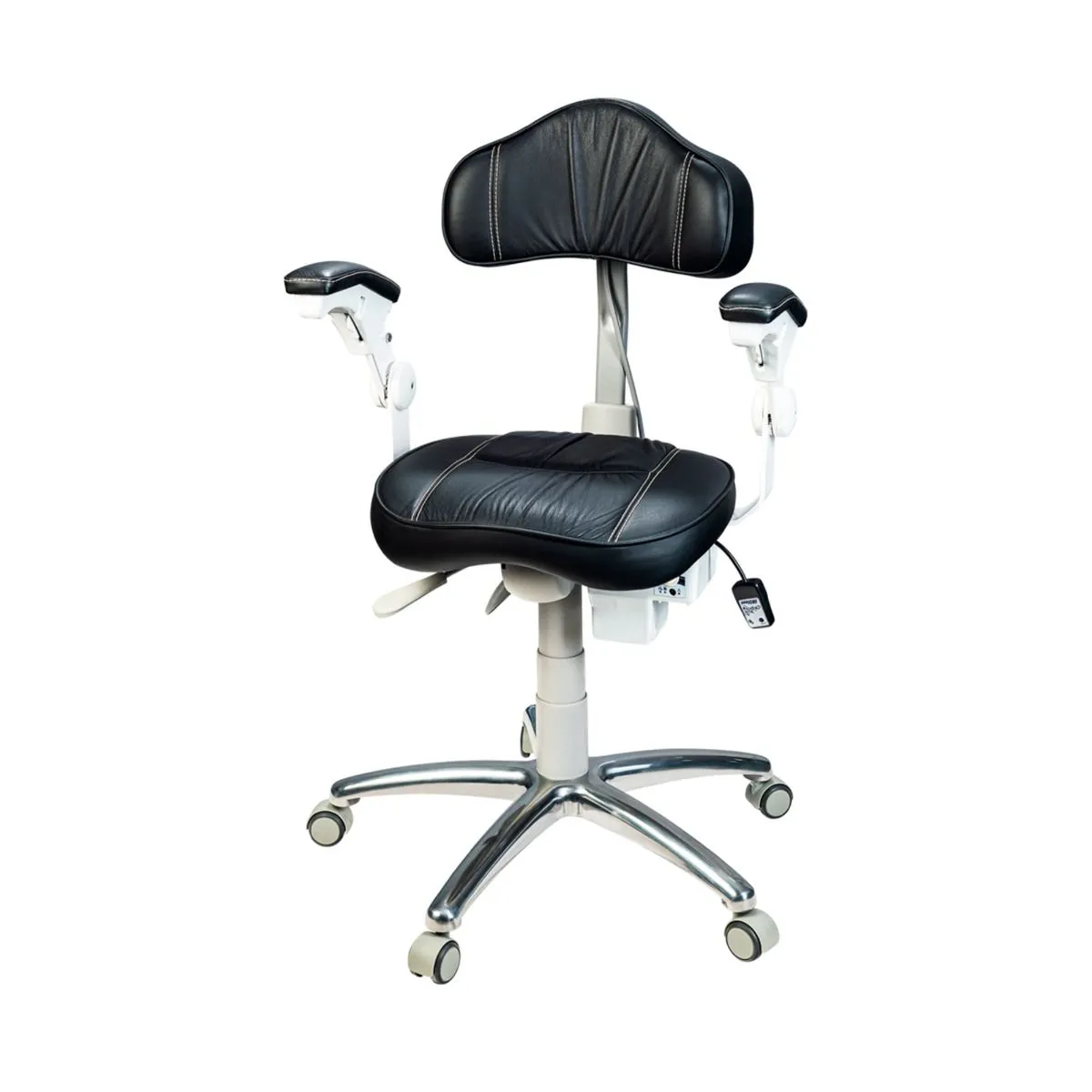 Base em alumínio, com cinco rodízios em PU, altura do assento regulável de 430 a 500mm e encosto de 370 a 440mm, acionamento a gás, reclinação do encosto com movimento sincronizado no assento, assento tipo sela, sistema de massagem localizado no encosto, apoio para braços e estofamento em espuma densidade 33 com PVC laminado.